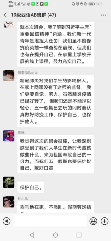 当我读完习近平主席的回信后,我的内心感到无比的激动。党和国家始终心系每一位留学生,特别是在国外疫情爆发之后,学校和中国驻西班牙大使馆时刻关注我们的情况,让我们感受到了祖国的温暖。作为一名普通的在校大学生,我们不仅要好好珍惜宝贵的学习时光,学好专业知识,还要争做有理想, 有本领, 有担当的新青年,勇挑重任,让青春在党和人民最需要的地方绽放绚丽之花。