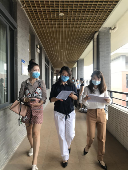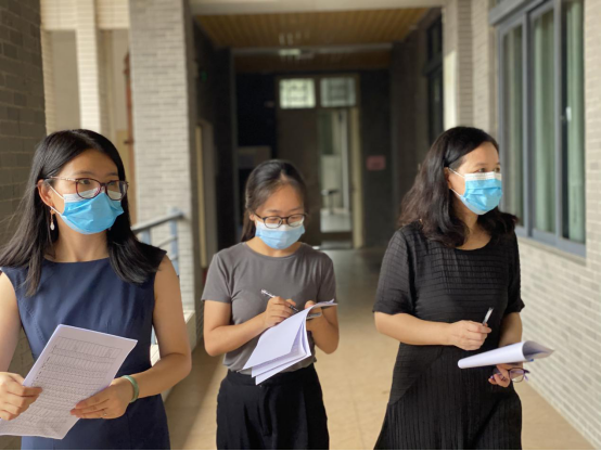 院长廖益清(右)、院长助理兼大学外语教学中心副主任何瑜(左)、教务秘书何燕(中)巡课