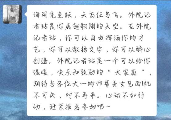 外院记者站是一个能够锻炼和展示自己的平台,机会留给每一个想提升自己的小可爱,记者站欢迎大家