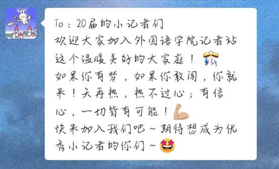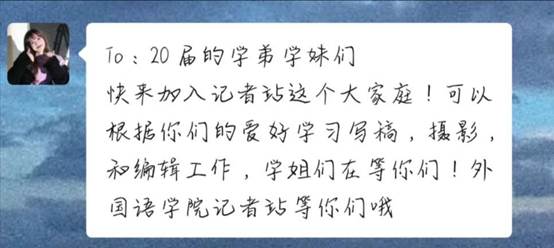 To小萌新们,外院记者站是一个很有爱的大家庭哦~加入我们,我们会帮你发现自己的闪光点,让你的大学生活快乐且充实哦~期待你们的加入!