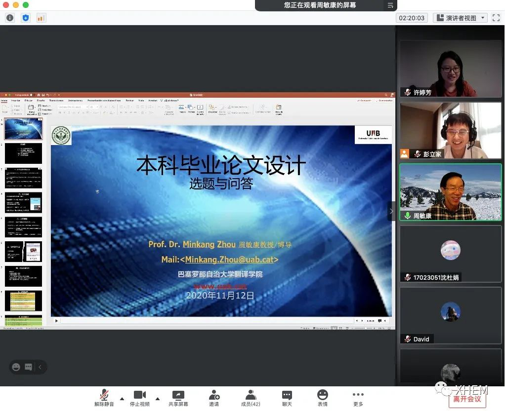 11月12日下午,巴塞罗那自治大学翻译学院终身教授暨东亚研究中心主任、中山大学新华学院122cc太阳集成游戏西班牙语专业首席教授周敏康,从西班牙走进中大新华西语专业,为高年级学生们仔细讲解了有关西班牙语专业毕业论文的方向选择和写作方法。西班牙语专业副主任许婷芳老师与专业教师彭立家老师共同主持本次讲座流程。