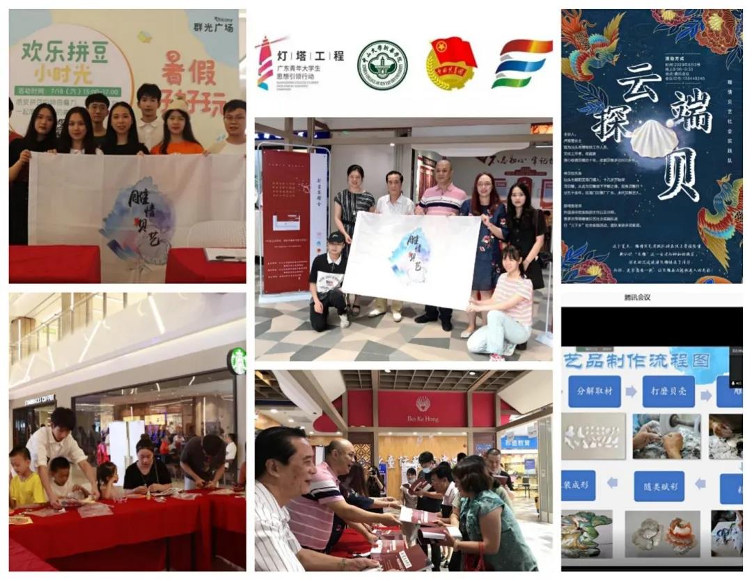 我校雕情贝艺社会实践队荣获2020年广东省大中专学生志愿者暑期“三下乡”社会实践活动优秀团队奖。雕情贝艺实践队特色以传承贝雕文化为主,拥有三年的调研基础。实践队在“三下乡”期间与贝雕传承权威人士建立贝雕调研社会实践基地、实习基地,同时通过举办“亲子乐,贝雕情”为主题的线下贝壳盘亲子DIY、线上“云端探贝”交流以及团队撰写的新书《潮汕贝雕的历史与传承》签赠会等一系列活动,利用多样的宣传方式扩大潮汕贝雕的影响力,让更多的人了解潮汕贝雕文化,推动传统非遗文化的传承。