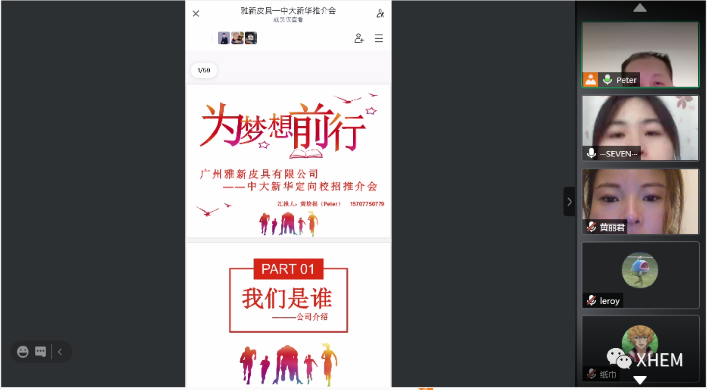 1月9日晚上,122cc太阳集成游戏西班牙语专业通过腾讯会议平台举办了广州雅兴皮具有限公司中大新华定向校招推介会。
