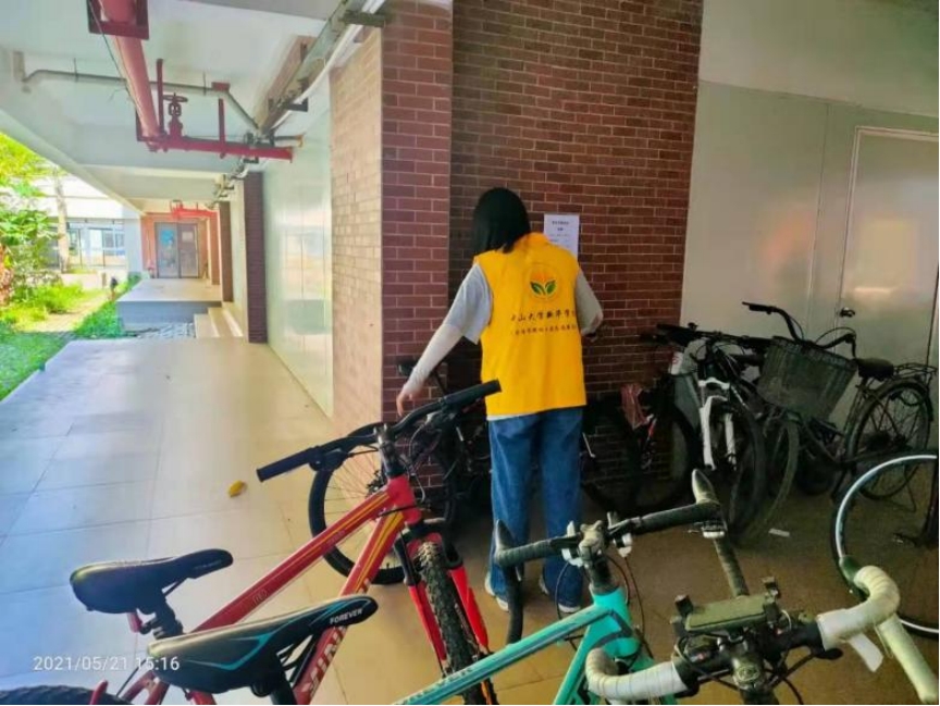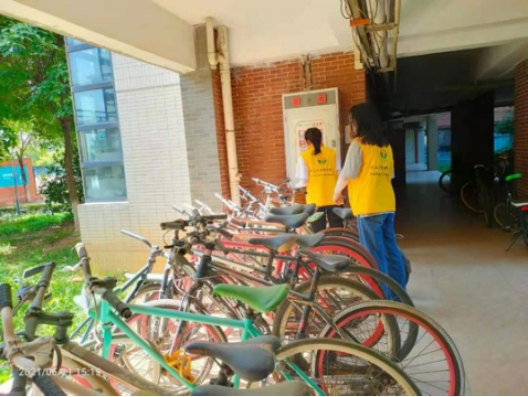 来到了自行车停放点,大家听从指挥、认真负责、耐心仔细地将它们一一摆正。在大家的共同努力下,单车停放点变得整洁、干净,志愿者们也露出了开心的笑容。