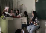 在此之后,迎来了20级学生准备的弹唱节目。教室灯光熄灭,手机上的点点“星光”亮起,伴着电子琴与吉他,三位学姐演绎了一首大家耳熟能详的流行曲《晴天》,寓意着新生们即将进入的大学生活如晴天般阳光美好,温暖动人。老师们也拿起话筒即兴发表了对新生的寄语,希望大家能和这个有温度的集体一起成长,一起进步,变成最好的西语人。