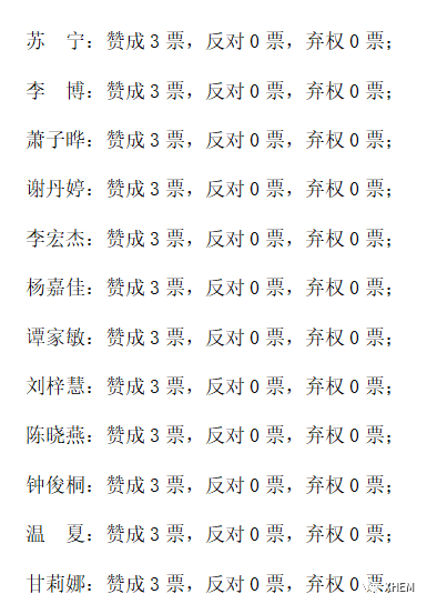 本支部应到正式党员3名,实到3名,经过评议和无记名投票表决,同意苏宁等12名同志按期转正为中共正式党员。名单及得票情况如下: