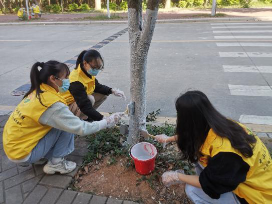 在刷树的过程中,党员同志们认认真真,一丝不苟。他们小心地呵护着每一棵树,一棵树接着一棵树地刷,很快便掌握了刷树的要领,越发地熟练起来。大家全身心地投入到刷树活动中,全然忘记了自己已经刷过了多少树,上下来回挥动了多少次手臂。尽管石灰已沾在手上、鞋上和衣服上,他们依然不管不顾;尽管多次地弯腰已让他们感到十分辛苦,但他们也没有抱怨过一声;尽管大树的树皮开裂严重,需要多次返工,但党员同志们不怕脏、不怕苦、不怕累,坚持将工作完成好,每一位党员同志都是如此。大家齐心协力,互帮互助,在不到两个小时的时间里为范围内的树木全部穿上了新装,圆满完成了此次刷树的任务,他们乐在其中,享受志愿服务的快乐,每个人脸上都洋溢着因劳动而收获的喜悦笑容。他们将刷树活动看作是一次独特的人生体验,将志愿活动看作是一次特别的生命体会。