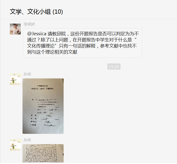 2022届毕业论文开题报告审查工作分为语言学、文学(含文化)、翻译、经贸、教学方向小组,分别对2018级英语、商务英语、西班牙语、葡萄牙语专业的开题报告进行审查。各方向小组审查老师微信群讨论学生毕业论文开题报告内容问题,认真批阅每一份开题报告,对存在的问题进行详细批注,以便给予学生明确、具体的修改意见。