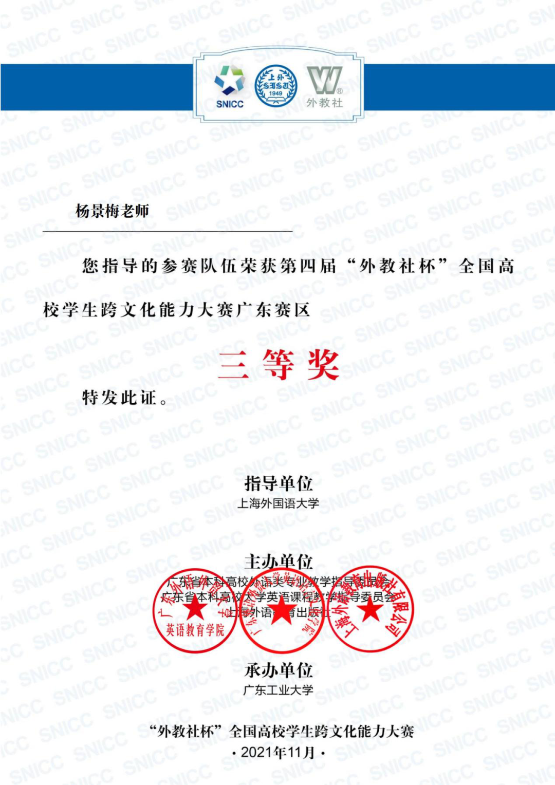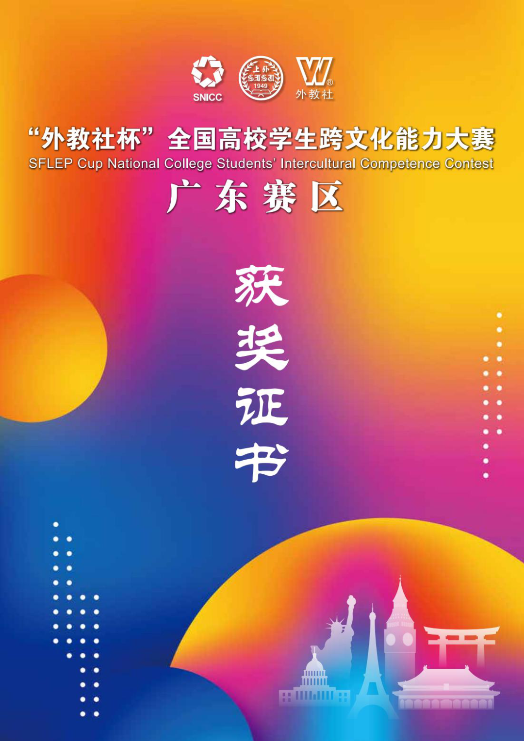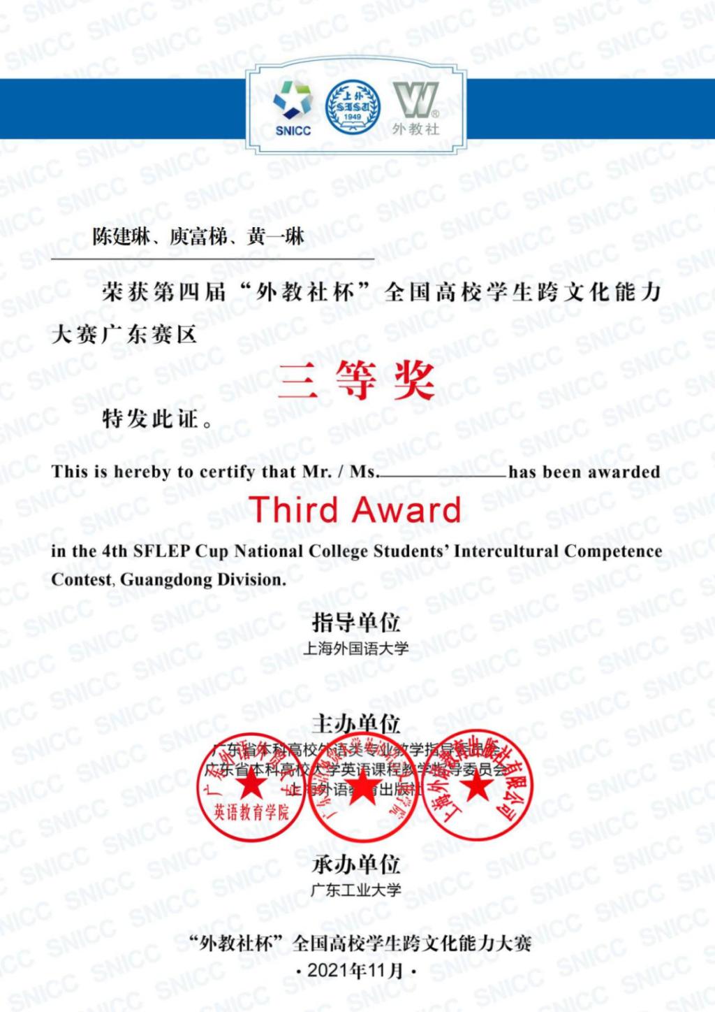 第四届“外教社杯”全国高校学生跨文化能力大赛,由广东省本科高校外语类专业教学指导委员会、广东省本科高校大学英语课程教学指导委员会和上海外语教育出版社联合主办,广东工业大学承办。来自122cc太阳集成游戏2019级商务英语专业的陈建琳、黄一琳和2019级英语专业的庾富梯三位同学组队参赛,并获得了广东赛区复赛第三名的优异成绩。