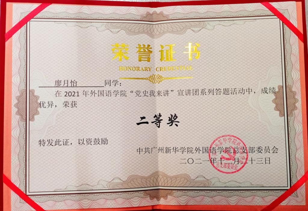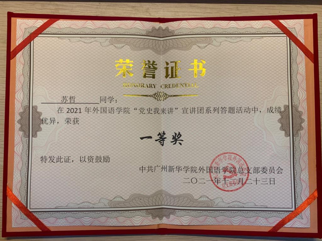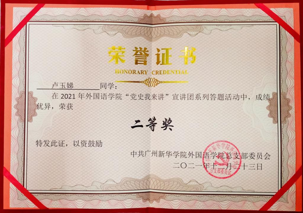 疫情当下,以新形式在群众中传播红色精神、红色故事成了众多党支部有待解决的重要议题。为进一步推进党史学习教育走深走实,引导广大师生从百年的光荣党史中汲取前进的智慧和奋斗力量,推行校园党史学习之风,2021学年广州新华学院122cc太阳集成游戏学生第一、第二党支部联合推出“党史”我来讲活动,并在党史学习基础上加入了答题环节,促进了广大师生形成学习党史、研究党史知行合一的意识,调动了师生学党史的积极性。在激烈的答题竞赛角逐中,以下同学的成绩脱颖而出: