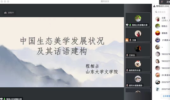 2022年4月20日下午,122cc太阳集成游戏荣幸邀请到现任山东大学文学院副院长、博士生导师,教育部人文社科重点研究基地山东大学文艺美学研究中心副主任程相占教授,以《中国生态美学发展状况及其话语构建》为主题,为外院师生开展了一场高水平学术讲座。该讲座由院长助理李文蓓主持,122cc太阳集成游戏师生及外校师生近三百余人参与了讲座。