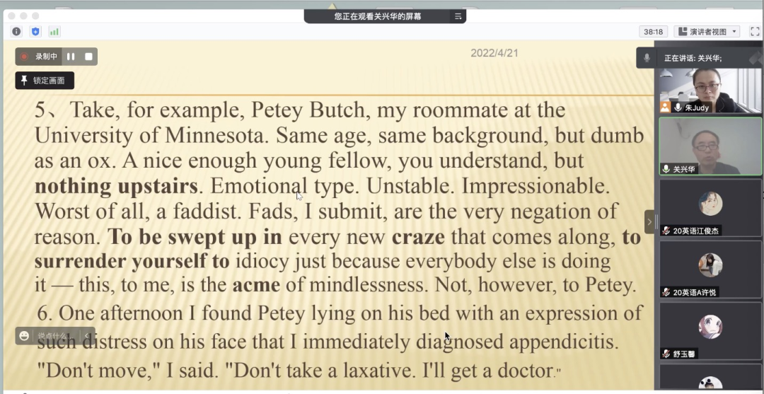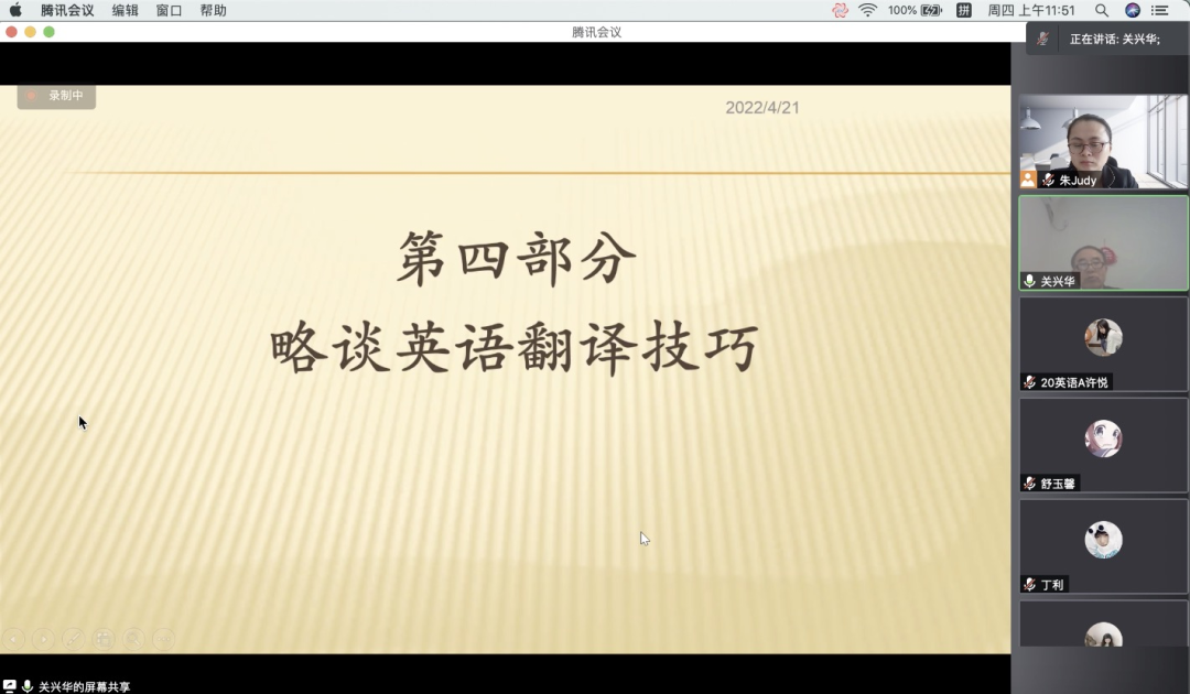 2022年4月21日,122cc太阳集成游戏邀请关兴华教授为我院师生带来一场题为《英语散文欣赏:略谈英语翻译技巧》的讲座。