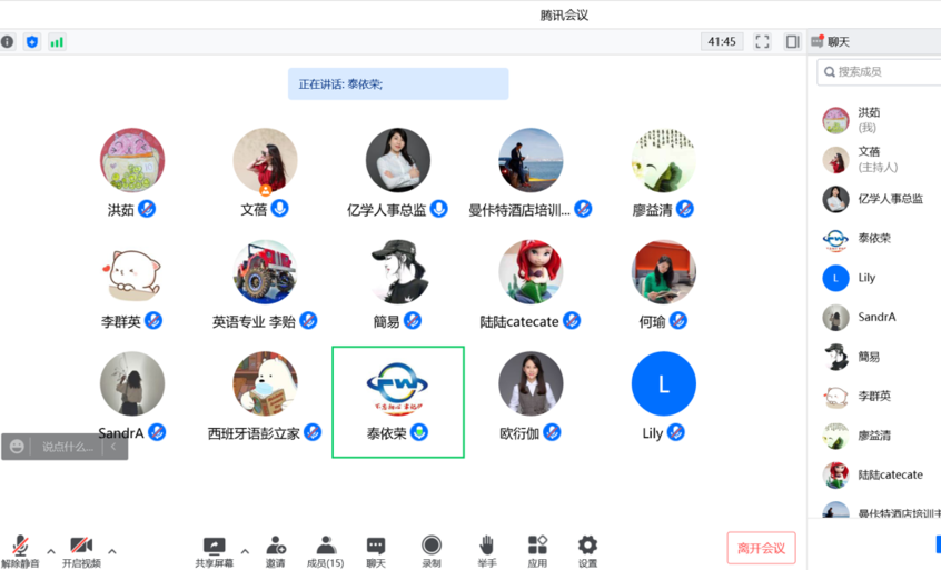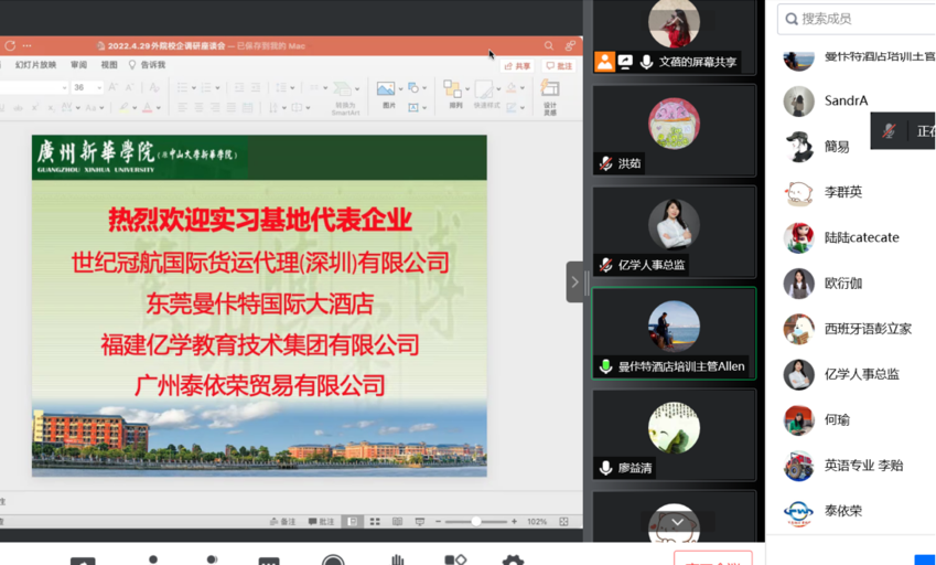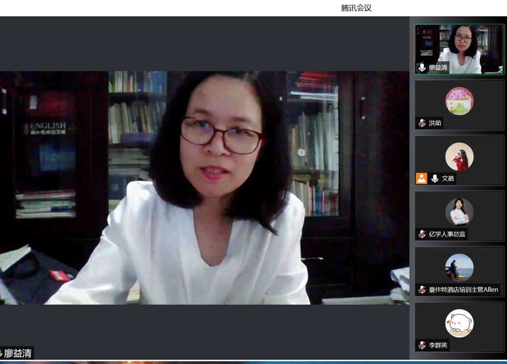 2022年4月29日下午,122cc太阳集成游戏荣幸邀请实习基地代表企业世纪冠航国际货运代理(深圳)有限公司、东莞曼佧特国际大酒店、福建亿学教育技术集团有限公司和及广州泰依荣贸易有限公司就人才就业和应用型人才培养展开了富有成效的线上座谈。外院执行院长廖益清教授高度重视在疫情防控中访企拓岗促就业工作,积极回应教育部、广东省教育厅对推进毕业生就业工作的精神,深化校企合作,落实毕业生就业引导安排。出席座谈会的学院领导有执行院长廖益清教授、副院长何瑜副教授、党支部副书记欧衍伽、院长助理兼商务英语专业副主任李文蓓、英语专业副主任李贻、葡萄牙语教研室主任李群英、实践部主任洪茹、西班牙语专业教师代表彭立家。与会企业领导有世纪冠航国际货运代理(深圳)有限公司陆燕贞助理总经理、东莞曼佧特国际大酒店尹莉丽总监、福建亿学教育技术集团有限公司胡淑芳人事总监、广州泰依荣贸易有限公司梁绍文总经理。本次调研会由李文蓓院助主持。