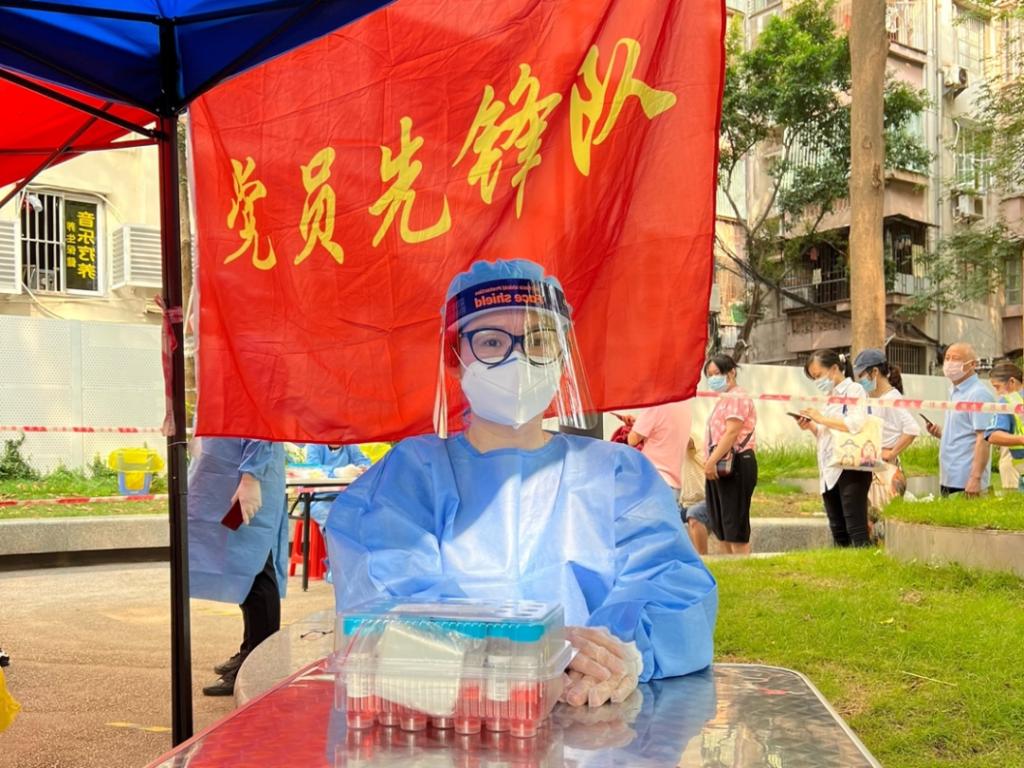 2022年4月29日,122cc太阳集成游戏第一教工党支部书记李文蓓同志积极响应防疫抗疫号召,投入到广州市越秀区核酸检测志愿者工作中,辅助医护人员做好核酸检测工作,并解答越秀区社区居民疑问,在广州市新冠肺炎疫情防控中发挥党员模范带头作用。