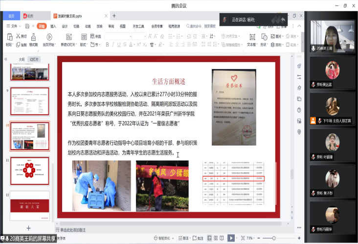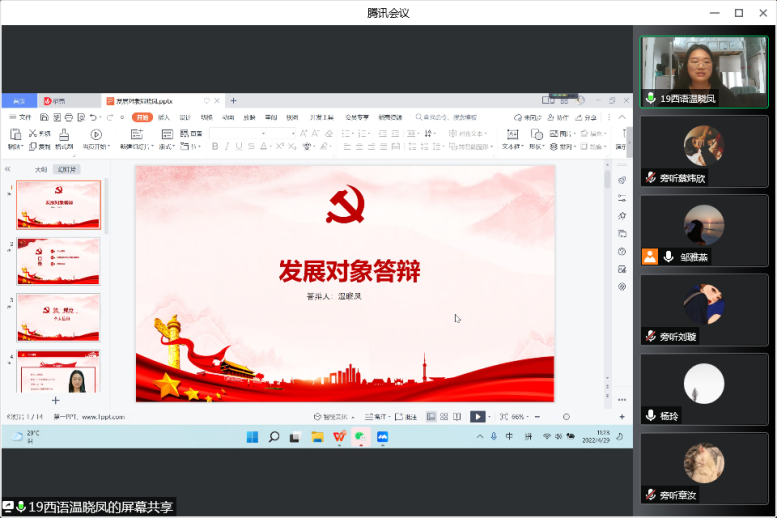 温晓凤同志表示:在发展对象期间,她积极参加校团委举办的党史答题活动以及122cc太阳集成游戏党支部举办的线上教育讲座;她以心之所向、情之所向、情之所愿、精神追求来概括她的入党动机,并表示她会坚持不忘初心、牢记使命,向党组织靠拢。