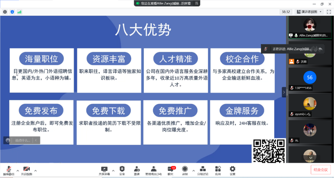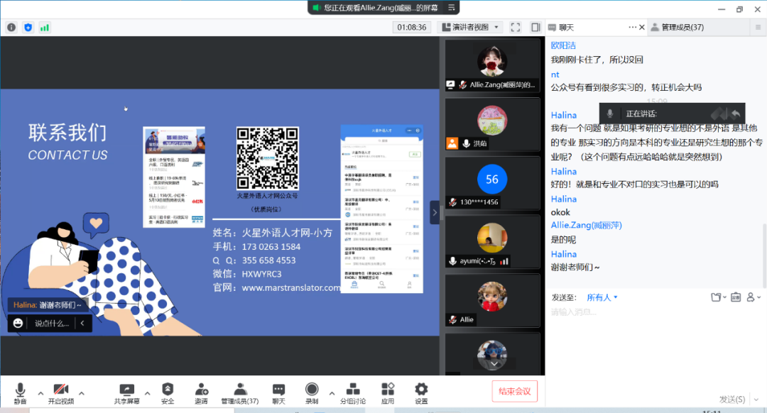 招聘会第三分会场由实践部主任洪茹老师主持,受邀企业为深圳市昆仲科技有限公司。昆仲科技的臧丽萍经理和陈嘉瑜经理分别向同学们介绍了昆仲科技旗下的外语岗位招聘平台——火星外语人才网。火星外语人才网集合了入驻平台的与外语专业相关的企业招聘信息,包括实习岗位和全职岗位。所有的入驻企业和招聘单位都均经过火星外语人才网筛选和认证,同学们可以根据自己的兴趣和能力,自由而有目的地投递简历。据陈经理反馈,我院一位19级商英学子从四月初至今在该平台完成了线上实习并成功拿到火星外语人才网的实习证明。昆仲科技欢迎各位求职的同学登录该网站了解就业市场,积极应聘心仪的职位。