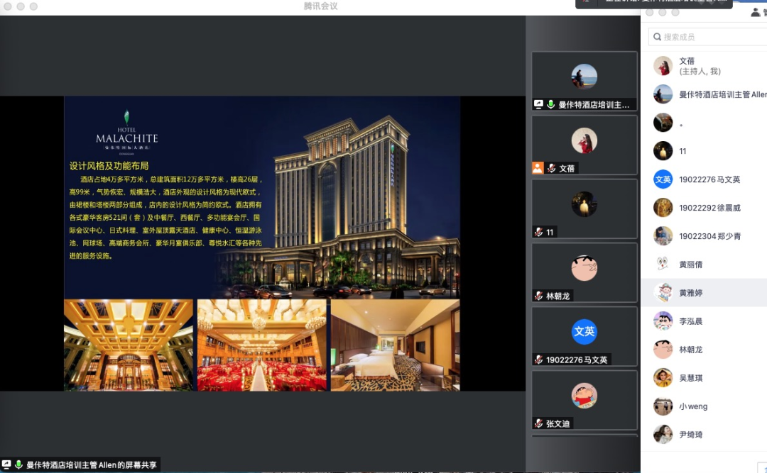 招聘会第一分会场由院长助理李文蓓老师主持,受邀企业为曼佧特国际大酒店。首先,该企业人事培训主管纪华伦先生做了宣讲,向同学们详细介绍了曼佧特国际大酒店的基本情况、规模以及酒店招聘岗位的信息和需求。宣讲结束后,同学们积极报名线上面试,与纪主管连线互动,主动介绍了自己的就业动机和兴趣,针对心仪的岗位做了应聘面试。