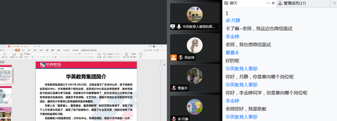 招聘会第二分会场由实践部副主任周雪清老师主持,受邀企业为中山市华英教育培训中心。华英教育人事部覃老师热情地向各位同学介绍了华英教育培训中心的规模和招聘岗位,各位有志于在教育和培训行业发展的同学纷纷向覃老师咨询了教育行业目前的发展情况。宣讲结束后,共有13位同学马上与覃老师建立了微信联系,投递了简历,并在线上完成了相关职位的面试。