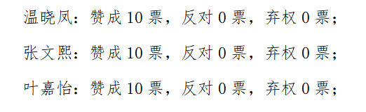特此,经过评议和无记名投票表决,同意温晓凤等3名同志发展为中共预备党员。本支部共有正式党员10名,实到10名。名单及得票情况如下: