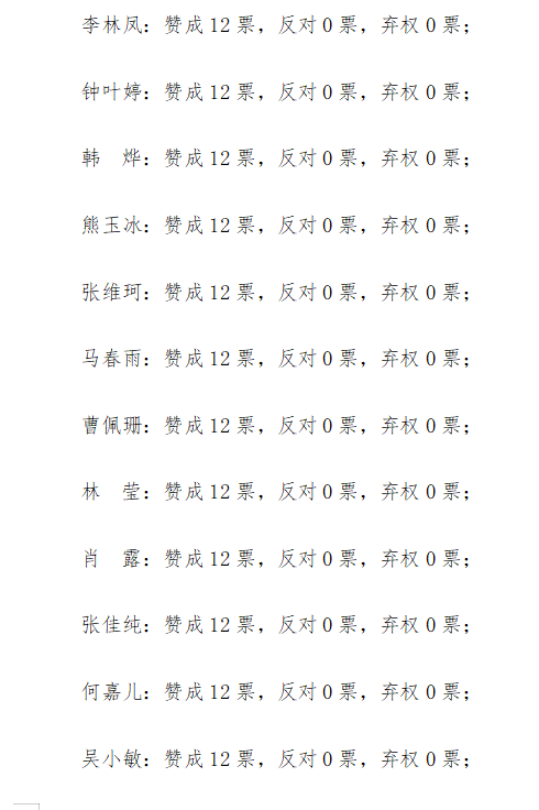 本支部应到正式党员13名,实到12名,经过评议和无记名投票表决,同意李林凤等12名同志按期转正为中共正式党员。名单及得票情况如下: