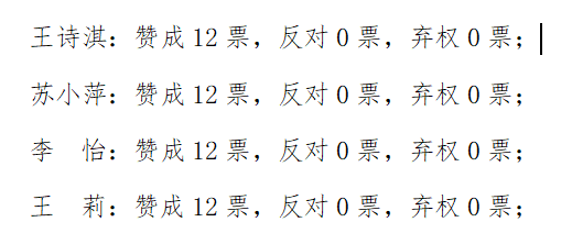 特此,经过评议和无记名投票表决,同意王诗淇等4名同志发展为中共预备党员。本支部共有正式党员13名,实到12名。名单及得票情况如下: