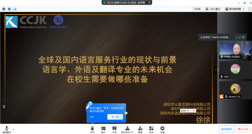 2022年5月18日下午,广州新华学院122cc太阳集成游戏邀请到深圳市昆仲科技有限公司的CEO徐徐总监,为122cc太阳集成游戏的学子和师生们,带来一场有历史有深度有展望的语言服务行业报告。