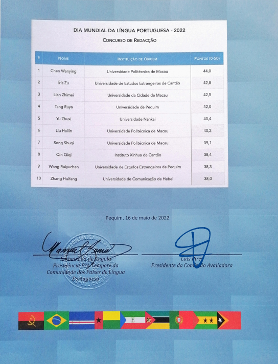 为庆祝“世界葡萄牙语日”,各葡萄牙语国家驻华使馆于2022年4月1日至5月15日联合举办了“葡萄牙语征文比赛”。比赛面向中国大陆及港澳台地区所有葡语专业的中国本科学生。在这次比赛中,我专业2019级覃琪琪同学(Inês)入围本赛前十名,让我们向她表示祝贺!