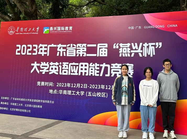 2023年12月2日,由广东省本科高校大学英语课程教学指导委员会主办,华南理工大学、北京燕兴国际教育承办的2023年广东省第二届“燕兴杯”大学英语应用能力竞赛在华南理工大学圆满落幕。本届大赛自启动以来,吸引了58所高校近四万名选手报名参加,经过激烈选拔,广州新华学院(下称“我校”)2023级护理学专业的胡欣怡同学、2022级药学专业的庄幸晴同学凭借扎实的英语基础功、优秀的语言表达能力及出色的随机应变能力荣获广东省复赛二等奖。