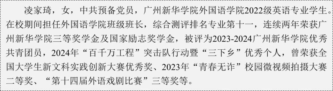 凌家琦同学在大学期间,不仅在学业上取得了优秀成绩,更在个人成长和全面发展上得到快速提升。她深刻理解到,新时代的大学生不仅要有扎实的专业知识,还要有全面的素质和能力。因此,她积极参与各类竞赛活动和社会实践,不断提升自己的团队协作能力和创新能力。