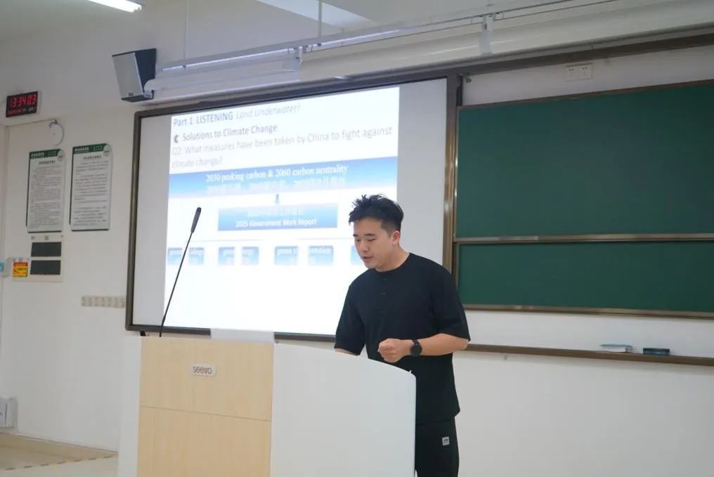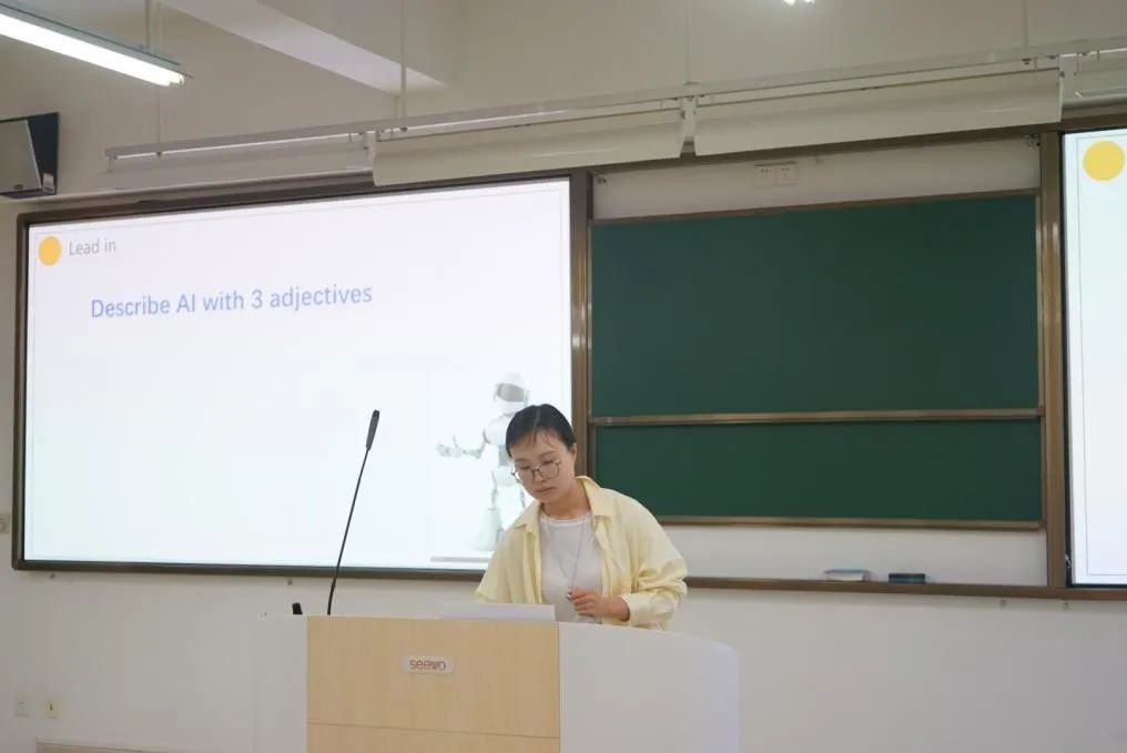 张晏瑀老师在授课中展示了关于人工智能与人类关系的内容,涵盖气候变化的影响、解决方案,以及如何倾听主要观点和细节。张老师通过引导学生批判性思考,强调了AI的积极特性,如有帮助、创新和高效,并探讨了AI可能带来的挑战,为评委呈现了一堂生动的英语综合课。