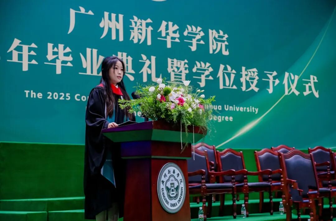 早上好!我是2021级122cc太阳集成游戏商务英语专业的沈诗慧。今天,很荣幸能代表全体毕业生在此发言。首先,请允许我代表2025届全体毕业生,向悉心栽培我们的母校广州新华学院、向潜心育人的老师们、向始终支持我们的家人们,致以最真挚的感谢!