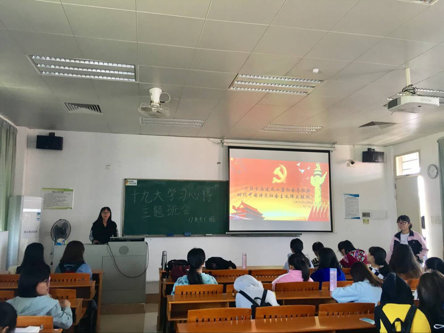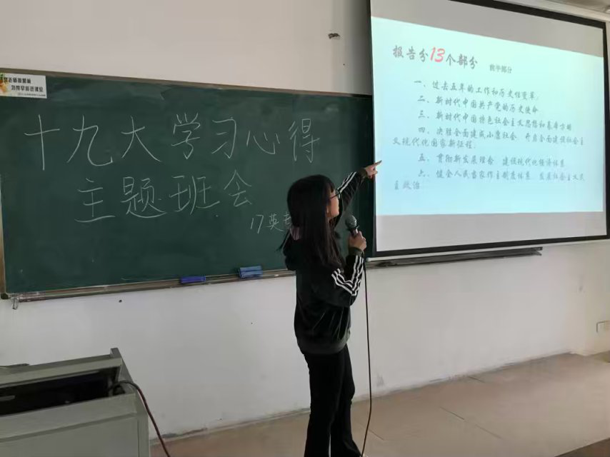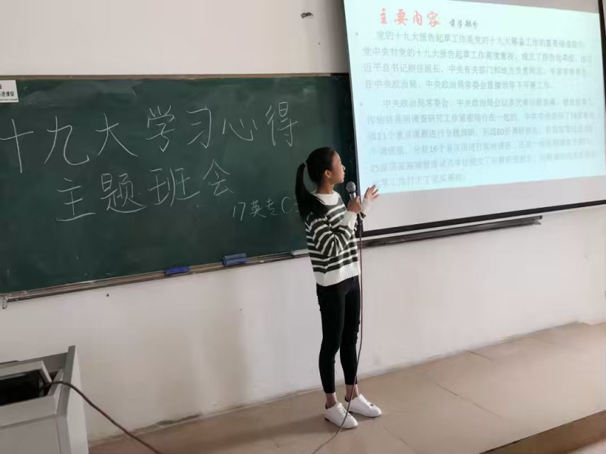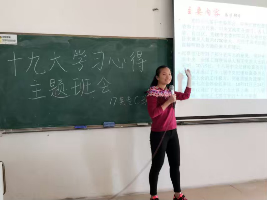 10月31日上午,2017级英语C班班委与C班同学在定静2B601教室里开展了主题为 《决胜全面建成小康社会夺取新时代中国特色社会主义伟大胜利》的交流活动。班长陈艳芳,团支书霍镜丽,作为普通团员参加此次交流活动,学习委员杨诗咏,文娱委员陈嘉雯应邀出席活动。