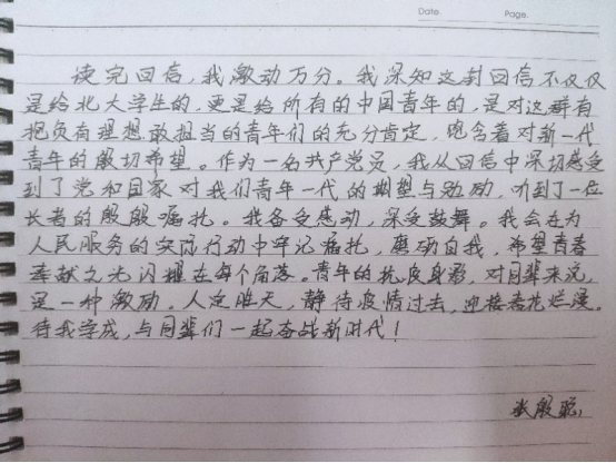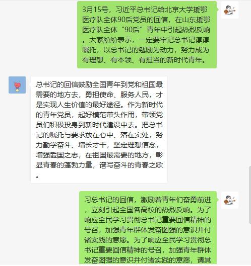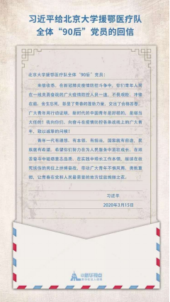 3月15日,习近平总书记给北京大学援鄂医疗队全体“90后”党员回信,向在新冠肺炎疫情防控一线奋斗的广大青年致以诚挚的慰问与鼓励。习近平总书记在信中说道:“青年一代有理想、有本领、有担当,国家就有前途,民族就有希望。”