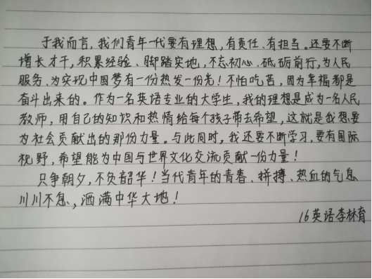 “青年兴则国兴,青年强则国强。”青年一代是充满希望的一代,同时也是满怀责任的一代。作为青年一代的我们,应始终牢记习近平总书记对我们的嘱托,争做有理想、有本领、有担当的新时代青年,用实际行动担负起时代赋予的责任与使命,让青春在党和人民最需要的地方绽放绚丽之花!
