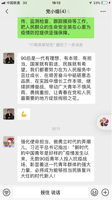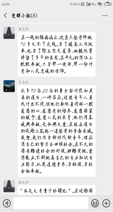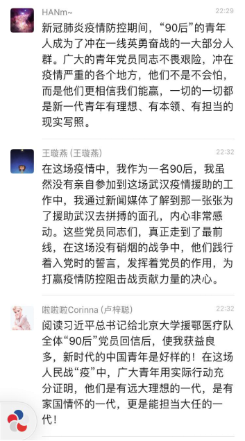 通过这次讨论,我受益匪浅。自己也同样是一名90后的党员,我虽然没有上战场发挥自己的价值,但是我也做好自己身边能做对每一件小事。不断地做好身边人的工作,不断传输给他们正确的防范做法,出门带好口罩,勤洗手,少出门。配合安检人员的检查,为疫情防控尽自己的力量。当家人们看的英文和中文结合版报道,错误翻译的版本的时候,我告诉家人们,亲人们,那是错误的消息,不要跟风转发朋友圈微信群,不要信谣不要传谣。青年一代的我们,有理想、有本领、有担当,我们也会努力在为人民服务,在实践中增长工作本领,让青春在党和人民最需要的地方绽放绚丽之花。