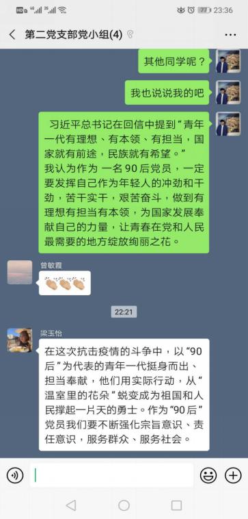 “青年一代有理想、有本领、有担当,国家就有前途,民族就有希望”,总书记语重心长的教导,深深地激励着每一位同学,在学生第二党支部各党小组中引起了热烈反响,支部同志们积极学习其回信内容并且纷纷表示要向疫情抗战前线的同志们看齐。
