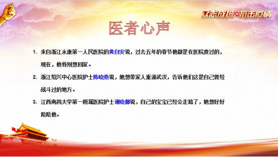 For example, Huang Zi’an, from the First People's Hospital of Yongkang in Zhejiang Province, said he had spent all the past five Spring Festivals at the hospital and he really wanted to come home and be with his family.