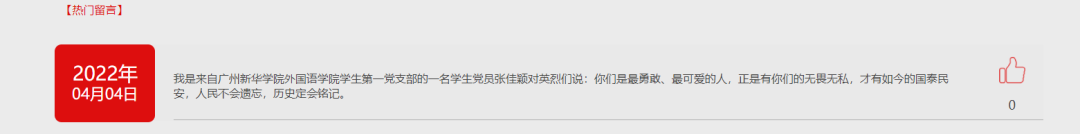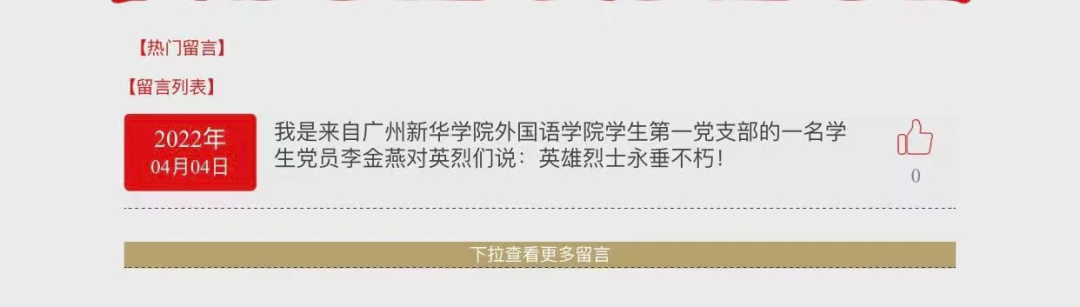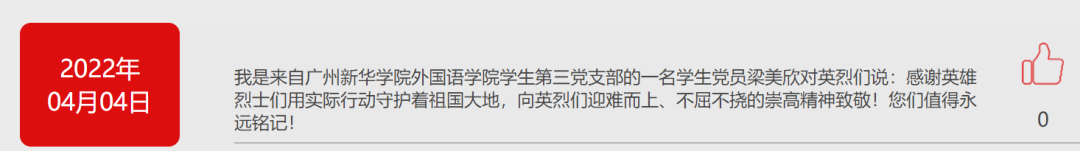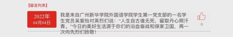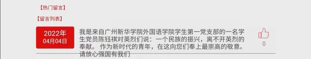 同志们还在留言区发表祭扫寄语,以此缅怀革面先烈的丰功伟绩。同志们也从本场活动汲取了力量,进一步了解了革命先烈为祖国,为人民抛头颅、洒热血的英勇气概,更深刻体会到先烈们坚贞不屈、无畏的高贵品质。