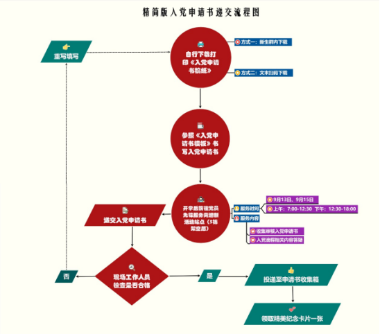 l 9月13日、9月15日,我们党员先锋服务岗的工作人员将分别在两天的上午7:00-12:30和下午12:30-18:00两个时间段坚守岗位,等待大家的到来。此外,对于所有在现场首次提交入党申请书且经工作人员检查相关的格式及内容符合要求的同学,我们都将赠送精美纪念卡一张作为奖励。