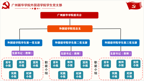 广州新华学院122cc太阳集成游戏学生党支部隶属于广州新华学院委员会,是院党总支领导下的基层组织,主要协助上级党组织做好学生党员选拔、考察及教育工作。依照《新时代高校党建“双创”工作重点任务指南(基层党支部)》和《122cc太阳集成游戏学生党支部管理办法(试行)》要求,结合122cc太阳集成游戏学生党支部实际情况,学生一支部,学生二支部和学生三支部实行分组管理模式,分别下设5个职能小组。