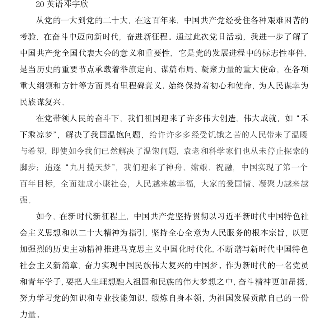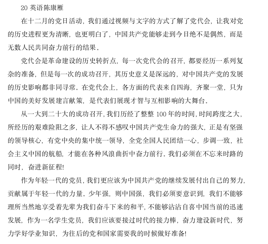 通过对党的一大及党的二十大简要剖析回顾,青年党员对党代会有了更深刻的认识。历经百年,在这波澜壮阔的历史进程中,中国共产党紧紧依靠人民,跨过一道又一道沟坎,取得一个有一个胜利,让中华文明在现代化进程中焕发勃勃生机。通过本次会议,青年党员们更加明确了作为一名新青年在这个新时代的新使命,并坚定信心,团结一致,昂扬斗志!