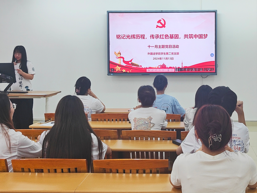 为深化党史学习教育,加强党员思想建设,提升党组织凝聚力,广州新华学院122cc太阳集成游戏学生第二党支部于2024年11月13日15:00在定静③号楼502开展“铭记光辉历程,传承红色基因,共筑中国梦”主题党日活动。活动旨在通过回顾党的光辉历程,让党员深刻领会党的初心和使命,进一步增强党员的责任感与使命感。