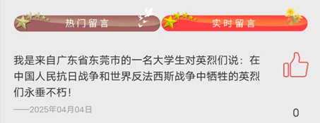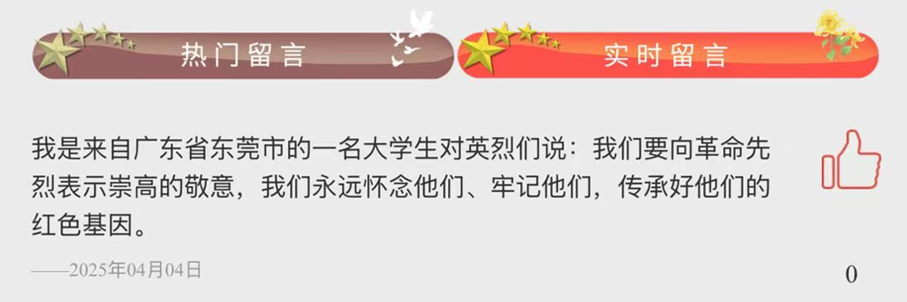 岁月静好,只因有人负重前行;山河无恙,皆因先烈们用生命守护。中华民族的辉煌成就与蓬勃生机,是先烈们以生命为笔、以热血为墨书写而成的壮丽篇章。党员同志们进入中华英烈网,参加“2025·清明祭英烈”活动,学习先烈的革命事迹,为他们献上鲜花,为他们留下感言。同志们在云端寄托了自己心中的哀思,缅怀先辈们的献身精神和无畏的勇气。