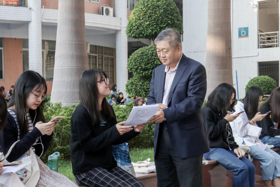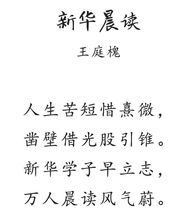 “早”这个字,在入学伊始,就烙印在每位同学的心中了。为了能让学生早日立志奋进,新华的老师们一直在努力。11月6日早上,迎着清晨的阳光,我校校长王庭槐教授就来到广州校区办公楼外的学生晨读区域看望正在埋头朗读的学子们。王庭槐校长看到师生们传承我校“早、正、严、实”教学原则,践行“三基、三严、三早”教学传统感到十分欣慰,并送给广大新华学子一首诗: