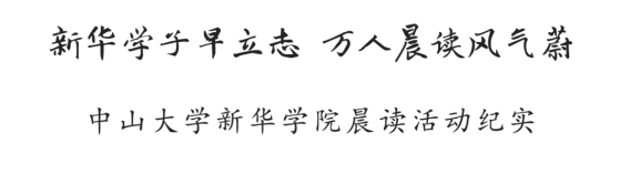 中山大学新华学院的晨读活动致力于督促全校学生养成早起晨读的良好作息,养成良好的晨读学习习惯,营造良好的学习氛围,并且做好学风的建设。让同学们能够充分利用早晨的时间来提高学习效率,增强学习记忆。“书读百遍,其义自见”,同学们充分利用晨读时间,回顾旧知识,预习新知识,能达到事半功倍的效果。