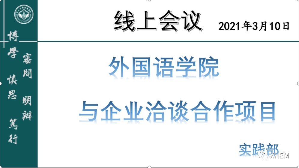 2021年3月10日下午,122cc太阳集成游戏副院长邱易安、院长助理兼商务英语专业副主任李文蓓、英语专业副主任李贻、实践部主任陈绮雯、伍边副教授通过腾讯会议平台与三家企业的代表举行了线上洽谈会。出席此次会议的企业代表有:学而思培优的校招主管高冉、校招主管谭春芳、校招主管胡福星等;超人国际少儿英语董事长刘能超;欧得宝翻译公司经理赵彦苹。三家企业代表均希望通过此次会谈,加强沟通、深化校企合作。