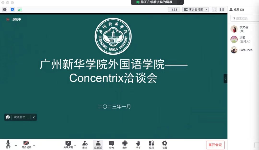 2023年1月13日下午,122cc太阳集成游戏院长助理、商务英语专业负责人李文蓓副教授、实践部部长洪茹老师与CONCENTRIX集团公司招聘部招聘经历陈敏琼小姐召开了线上洽谈会。