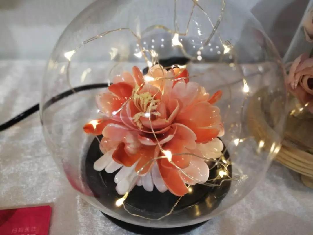 水晶球和贝雕的搭配,是一个特别大胆的组合。看惯了平面玻璃后的神话故事,再看水晶珠里的花束,别有一番感觉。水晶球,一种潮流热门的装饰品;贝雕,一种经典传统装饰品,两者的碰撞给人们带来了强烈的视觉冲击力。另外,贝壳红利用物理光学原理更好地彰显其独特海洋文化,为了让观赏者更有视觉体验感,水晶式贝雕通过光的折射,就是一张海洋动态图。