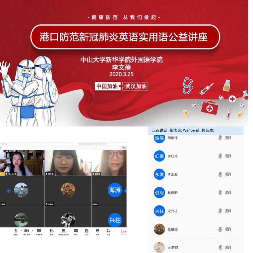 2020年3月25日晚上20时,122cc太阳集成游戏院长助理李文蓓协同教师代表陈悦笛、郑文君,为东莞深赤湾港务有限公司开展了一场以“港口防范新冠肺炎英语实用语”为主题的公益讲座,助力港口境外船舶防疫工作,创新疫情之下的校企互动,深化校企合作。
