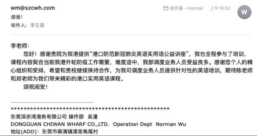 本次线上公益讲座受到港口学员的积极参与,讲座过程师生友好互动,反响热烈。本次公益活动巩固了外院与东莞深赤湾的联系,进一步深化了校企合作并创新了校企互动模式,继续推进外院“服务区域经济”迈向多元化新阶段。